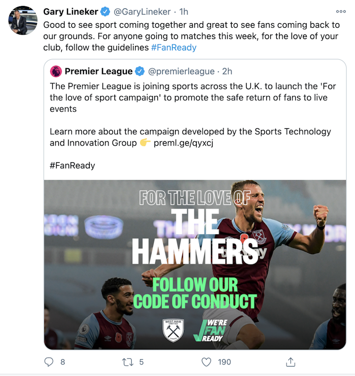 Working with the Premier League and various other sporting bodies, we were tasked with developing an awareness campaign that encouraged a safe return of fans to live sports and venues across the country. We created a visual identity that we supplied as a semi editable toolkit to those who wanted to adopt the campaign.